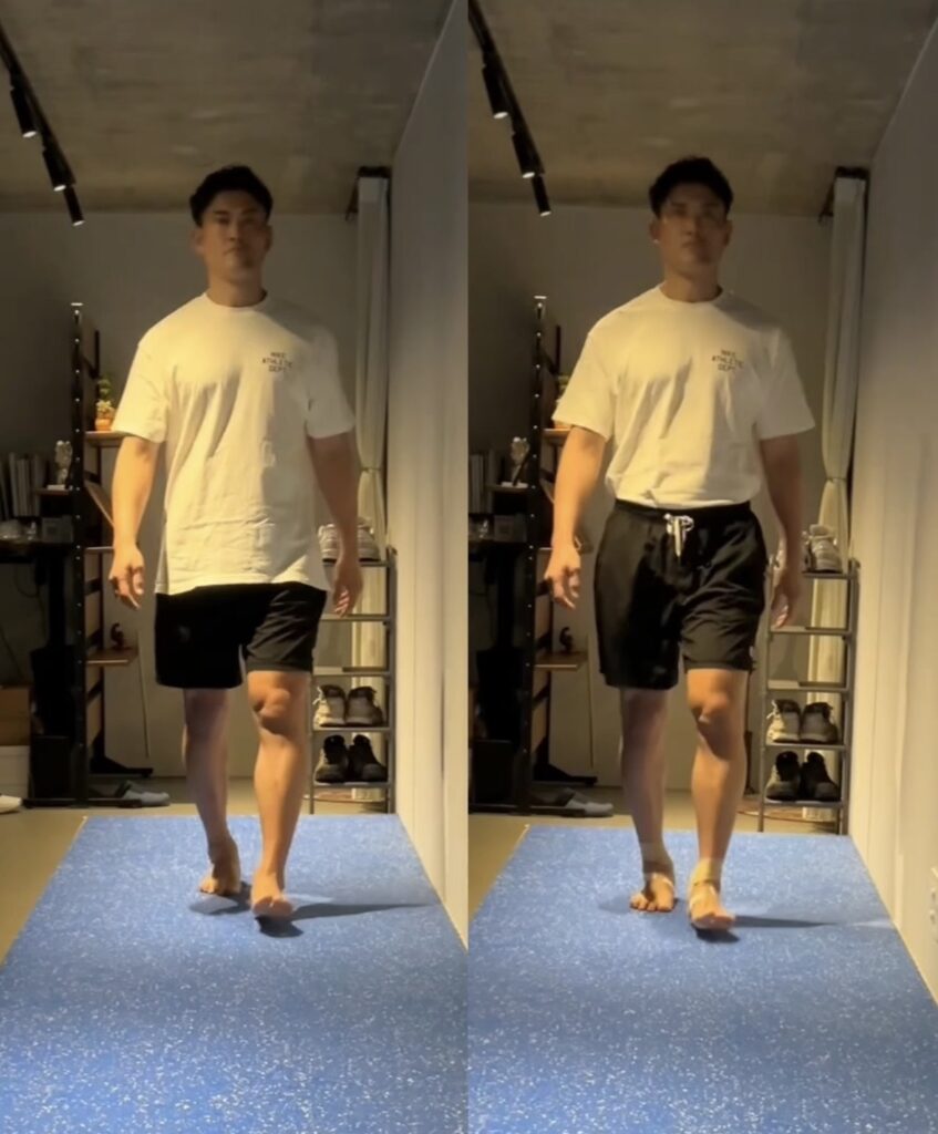 ※立脚終期の比較(左:裸足/右:テーピングやパッドによる評価後)